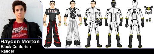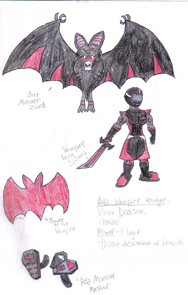 Ok, so, I was websurfing out of boredom one day. One of the things I love so much to read is people's original takes on things, for instance their own KH characters, and fan-fictions incorporating one's own characters in with existingones. That sort of stuff I just love. So, I came upon the site Rangerboard(I would've joined but the stoopid site wouldn't accept my Yahoo email ~_~) and there was a thread that showed people's original rangers in this awesome looking format. They actually looked professional and everything. I found the tutorial on how to do it, and voila! PRMB soard to new heights.Ta-Da! The first of the five, Vince Drason, the Red Vampire Ranger of Power Rangers: Monster Battalion. The first is him in normal clothes. I thought it would be cool to have his eyes be red naturally, and then some strands of his hair are dyed red. As with the usual Ranger Fashion, he only wears red. Red muscle shirt with Tribal Bat design. The next, I'm most proud of. I 've been toying with the idea of PRMB's Ranger Uniform. You know, like Mystic Force's thing that they each wear in Root Core, or the Jungle fury training outfits, even like Wild Force's Vest. Y'know, the thing that the rangers will wear in their base as well as rushing to the scene of a crime. I've devised, for PRMB, that it will be a sleevless hoodie(Got the image when I pictured them running through a townsuare wearing their hoods over the head, looking all cool and shtuff) and cargo shorts, with all black sneakers, at least for th boys. Haven't gotten to the girls yet. Each hoodie has their Ranger Symbol outlined over the heart, outlined, with a ranger color stripe going vertically through it. For the wristbands, the right has the upside down ranger symbol on it(got the idea of them doing a roll call, and wen they said their position and everything, they hold their fore arm up and the symbol is shown). The left wristband is the shape that goes with the symbol(vampire=triangle-ish). Shorts are The Rangers shape on the lower right, and a smaller shape on the upper left. Cargo pockets on lower left and upper right. The last two are self-explanatory. Ranger with and without helmet.