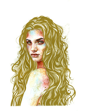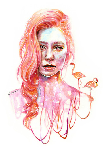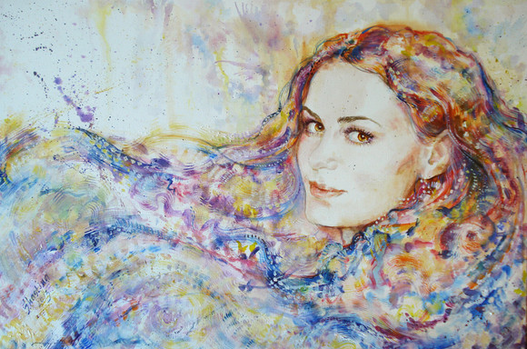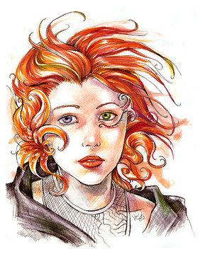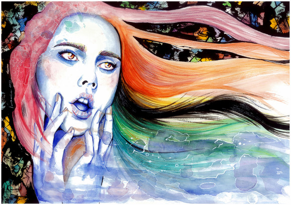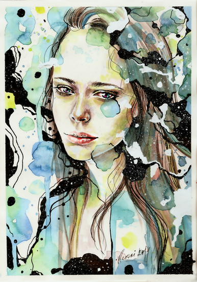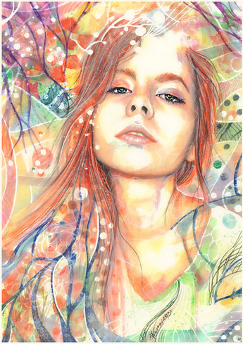 Good job incorporating all those details without letting them overpower the picture. I love how her lighter face just pops out from the background, and then you are drawn right into those wonderful eyes. Anyone who can work with watercolors as well as you do has my sincere admiration.