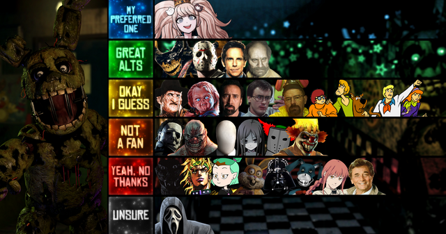 Good: Freedy Krueger (NOES), Dr. Bright (SCP Foundation), Jason Voorhees (FT13TH), Goji (The man in the suit), Bendy (Bendy and the ink machine), Midori (Your turn to die)