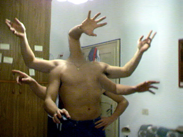. . . A "re-posting" of my own picture of ymself...holding some weapons with my 5 arms. Wh00tdawgs. Simple cit, paste, and blend. not too complicated.Related content