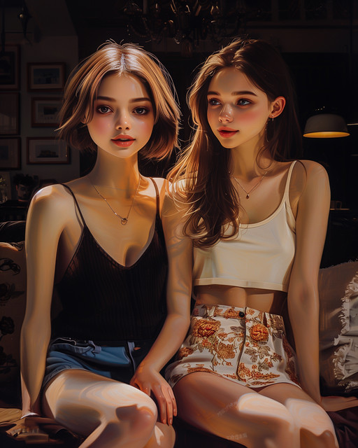 #drama #digitalart #anime #sexy #bedroom #blonde #brunette #corset #cute #females #friends #funny #girls #gossip #illustration #intimate #joy #laughing #lingerie #nightgown #playful #secret #style #whisper #ai_art #synthography