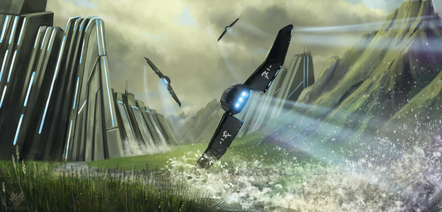 A P-066 Voidshark, built as a successor to the iconic Shark interceptor, conducts a test flight between the alien relic mountains of Hemiar IV. This nimble fighter was deployed extensively by the Beta Salaccis Free Navy during the Kobold War, and played a key role in defending the navy outposts stationed in Hemiar from kobold stealth strikes.