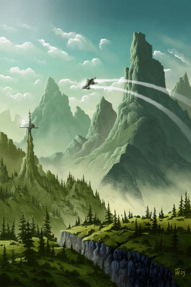 This is a painting I made as a cover for a fan-made Terran Trade Authority anthology. I took heavy inspiration from Simon Stalenhag and Stewart Cowley's artwork for this one. I used the JSPlacement hard surface generator to create the “techy” texture for the “mountains.” Also, the ship in the TTA version is based on a render of a 3d model by Malleus011, which can be found here: www.thingiverse.com/thing:4538…