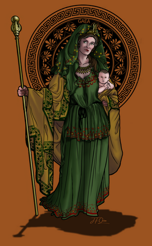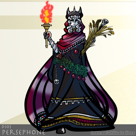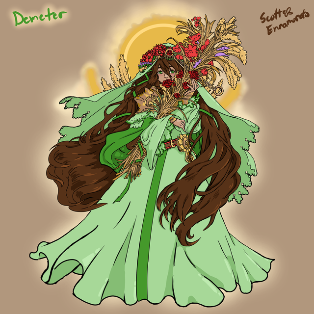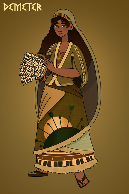 Demeter the goddess of soil, the harvest and fertility from Greek Mythology. Without her the land would be barren and she is one of the most respected of the Olympians. Because of her search for Persephone the torch became a symbol of heartbroken travellers.