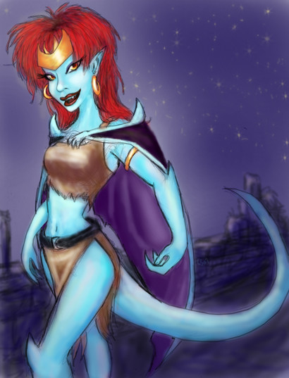 I'm not sure >< I thought perhaps more of a tone like Elisa had when she was a gargoyle. But, even that doesn't seem like it'd work. I think it'd be interesting to see her in white flesh, and black flesh..just cause but yeah.