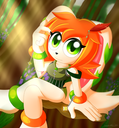 (Smile)"/>. The shading is really well done here and goes nicely with the background. But her pose is a little stiff like she is falling off of the tree she is sitting on, her right arm is shorter compared to her left arm. The background is super nice and calm but her body language and facial expression say other wise. Her body is tense and stiff, as I have mentioned earlier, she looks like she is waiting for something to come and attack her at any moment. Her face gives off that she is in an environment that she rather dislikes and wishes she was somewhere else. The background is really warm and fuzzy but Perci looks rather cold if you know what I mean.