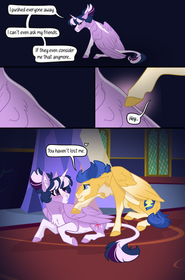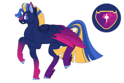 Dusk Rise used to be one of the happiest kids on the block. He was an alicorn, son of the co-ruler of Equastria, has an awesome and fun dad. What more could he want? Of course as a child he knew if his parents were to have a filly she would take is place as the next friendship co-ruler of equestria. But he never thought about that at all. They told him time and time again but he always pushed it over his shoulder saying it wouldn't happen. That is, until it did. They had a girl. And a runt at that. With no horn! He had his breath taken away. He became bitter. The friends he had he slowly started to distant himself from them. Planning on how to change the stupid law of no stallion can become next ruler or co-ruler unless he is the only child. Psh. Stupid. Although his magic is not entirely the greatest he started to practice over an over through hundreds of book to become better. To prove himself more. Even if he has to take the wrong road to his place back. Not only that, after Fire Bolt found out he wasn't next co-ruler he teased Dusk Rise about it. Which in turn, gave Fire a scar he will remember for a long time. As for his cutie mark, he doesn't get it until down the line. And they were surprised to have another alicorn born so soon. But unlike FlurryHeart, he was a bit...different in how he was born with his wings. While still in the womb, Twilight was practicing Magic, much to her husbands despise while carrying Dusk, until she found one where she could give a pony wings. Pricking her interest she tried it on a fruit. It all went down hill from there. Flash had burst in yelling at her to not do magic when she missed her subject and the bolt shot at a mirror straight back at her tummy. She became very sick not knowing what the affects were. That was until her son was born with wings.