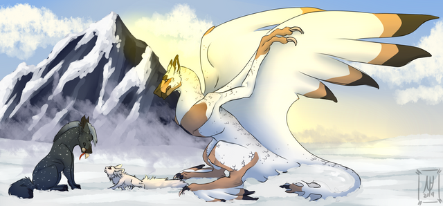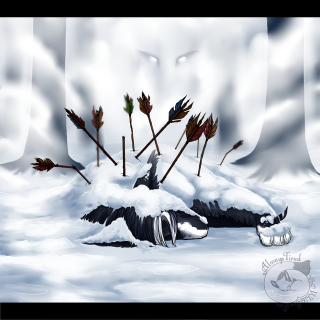 Hauberk took up the hare in his jaws once Caitlyn's arrow landed the killing blow, adrenaline still pumping through his ears, deafening him to the approaching doom. Caitlyn stood, proud of thier success, though the emotion left swiftly as a shadow descended upon them.