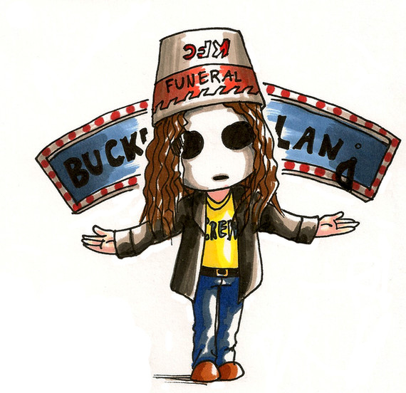 "'Who's this guitar playin sonsa bitch' is a question common asked. On his head is a bucket of chicken bones and his face a plaster mask. He's the bastard son of a preacherman, and on his town he left a stain. They made him live in a chickenhouse to try to hide the shame. He was born in a coop. Raised in a cage. Children feared him. Critics raged. He's half alive. He's half dead, but folks just call him Buckethead."
