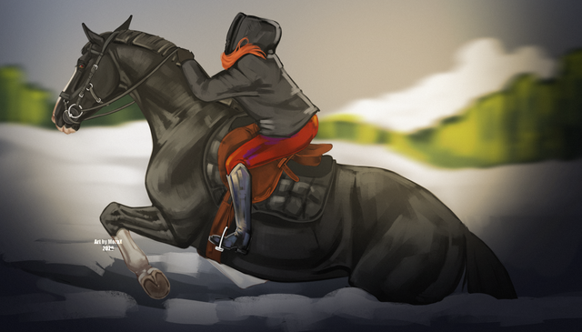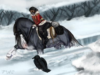 I don't know why it's so hard to figure out how big Soren is supposed to be compared to Mourning Cinder; I keep depicting them at different sizes I feel like XD Cinder's withers would be a bit over Soren's head while standing beside one another, but that's really difficult to gauge when she's actually in the saddle. Cinder looks shorter than she is here because of the snow, but I think I made Soren too big anyways lol.