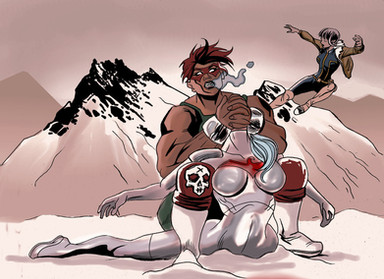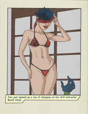 Page two of a three page series with Jinx getting into a bit of trouble. Jinx is unstoppable when she is blindfolded as Beach Head finds out the hard way. Once again Zakuman did the colors on this piece and you can find more of his work here... www.deviantart.com/zakumanRelated content