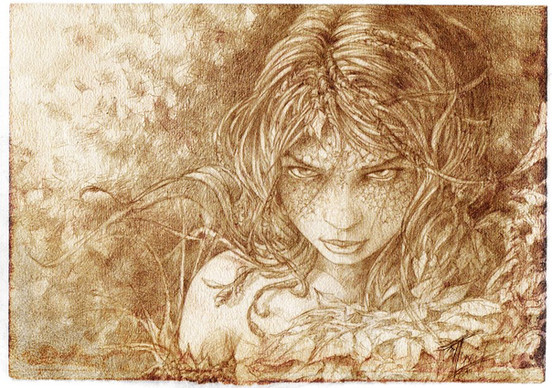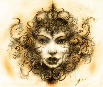I am loving all the life and movement to this piece as well as the light in her eye! The light and shadow in this piece are perfect but of course you are a MASTER at that!!!!! ~ The swirly-whirls are awesome and the leaf-like design among the cobwebs is cool too!The cobweb thingies remind me of old architectural corner brackets, which I am a total NUT for!!!