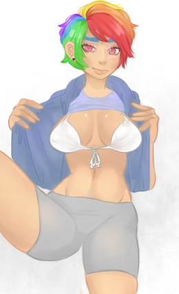 And back to ye, maker: nothing wrong with mixing pony and them hoomans. Humanizations are far from uncommon. And among humanizations, so is the sexy sort. I don't see anything wrong with you doing this. And should the urge to draw humans persist, I'd gladly welcome you fulfilling it via more humanizations, not necessarily of the saucy kind. But until then, well done!