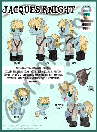 Ooh, very nice OC! I like the colors you chose for him. Also judging from his attire is he from a place that gets really cold? I like his scarf and hat a lot, but his cutie mark has an amazing design! I wish the references came with a bio, because I love reading up on that stuff!