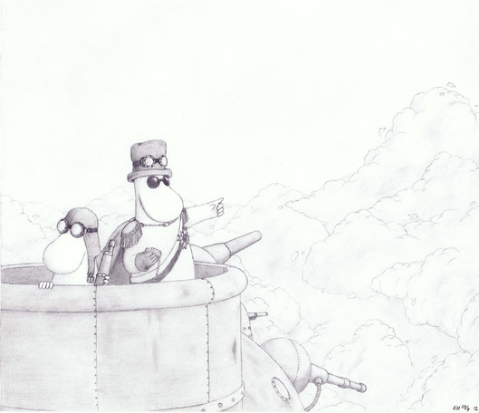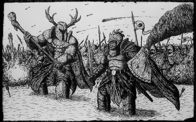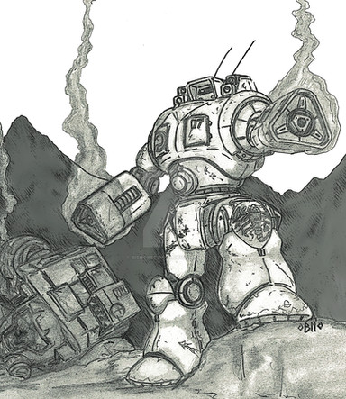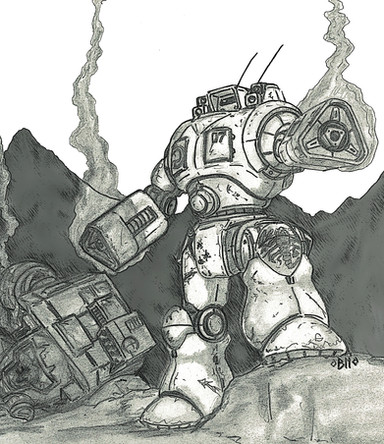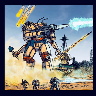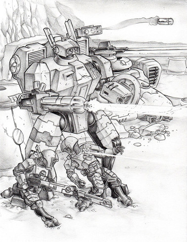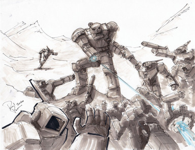 Good play with line strength, to bring out the centerpiece mech. I also like your unique way of rendering explosions in this one. Bravo. The smoke from the destroyed tank, while not looking bad at all, could benefit from some shadowing and forms to make it look more three dimensional.