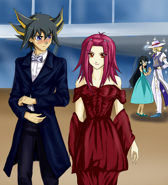 This drawing ROCKS! Yusei's dress is so darn pretty. And I have to admit, Jack looks good in his party outfit.