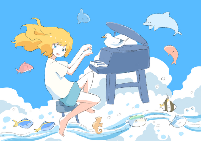 #anime #animeart #blue #blueocean #bluesky #blueskyclouds #colour #denwa #dock #fish #flat #girl #line #littlegirl #manga #mangaart #ocean #painting #sea #seaside #sitting #water #kyonkundenwa #sky