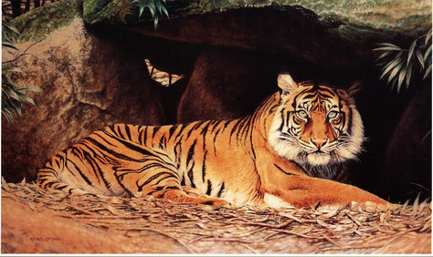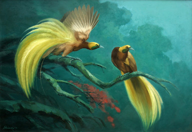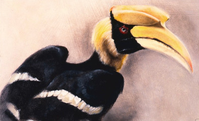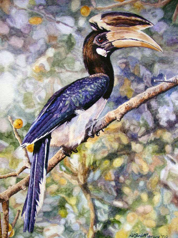 One of my favourite bird families, the sight of these huge birds, whose wing-beats can be heard miles away, is one of the great experiences of the Asian Forests which still disappear at an increasing rate despite all we think we've learned recently.A large Oil of Pied Hornbills which got me accepted into 'Birds in Art' for a second time and recently sold to a lovely couple in England.