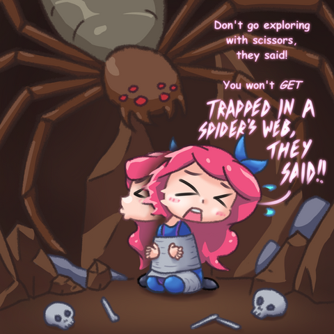 After saying that, a lot of small spiders started to surround Riley and Blade, and without losing a moment, the spiders started to wrap both of them up in a really tough web, They both tried to struggle out of it, but the were completely immobilized by the web. Finally, a slightly larger spider tied both of them to the ceiling, and they started to ascend until they both reached a considerable height. Blade was scared since he's somewhat afraid of heights, and being tied to a web didn't help at all. He was scared enough to forget that he had a horn and magic. Riley however was surprisingly chill after they both halted and was then surprised after what they had in front of them.
