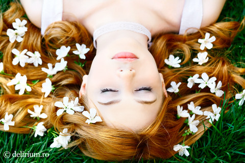 Everything is so gorgeous. Her dark eyes balance out her pale face and the flowers. They're light and sweet, and I think they balance the more serious expression the model (who is so pretty) is wearing. Lovely photo.