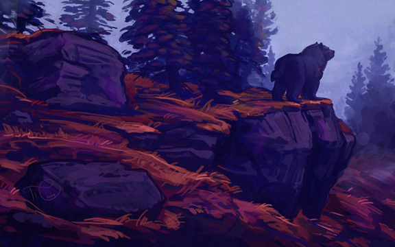 I think this is really good since I am a fan of the art of Bastion and Transistor. The bear is well drawn, the wide space is portrayed in such a way that the bear doesn't get lost there. I like the earthy colors and the composition; it portrays the natural terrain adequately. By presenting just a few elements, it helps the viewer to understand the image; there is no need to show a lot of things. Everything is well integrated as a whole. If you keep drawing like this, I know you will get far. Practice makes perfection e.deviantart.net/emoticons/b/b⦠" width="15" height="15" alt="