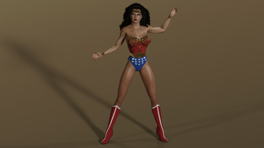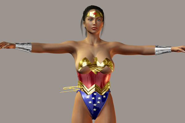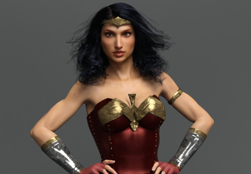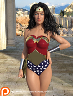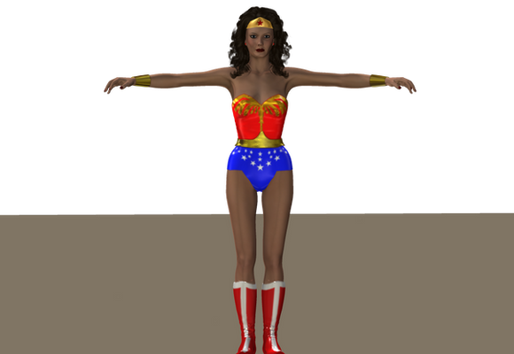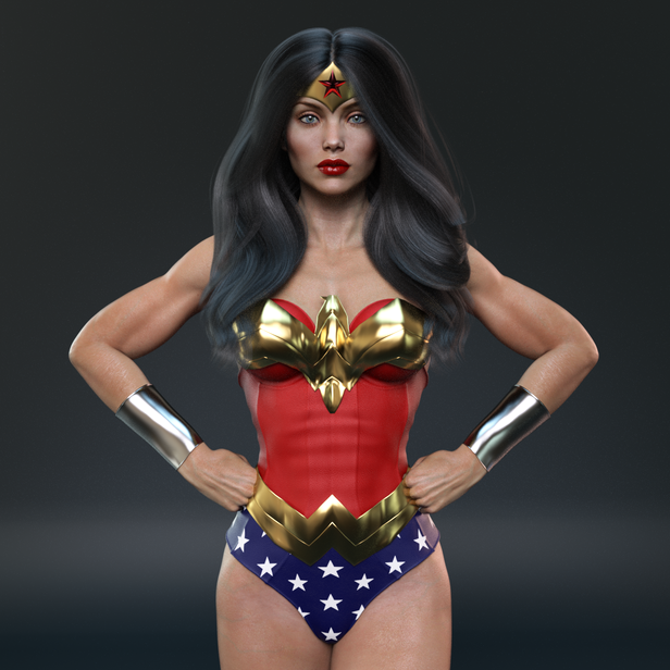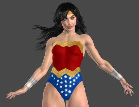 The Wonder woman costume that you see here is custom designed. It hasn't been completely surfaced yet, There are no shortage of Wonder Woman outfits out there for V4, and there are some good ones but none of them fit the look I was after. This is a single piece that's designed specifically for the Genesis 2 Female figure.Since this is a prototype, I just used some Black hair that was kind of close to what I wanted. This will not be her final hair piece. I'm actually designing a fibermesh hair set for her that goes back to the look that I find most appealling. I don't want the hair to look like trans-mapped hair--I want it to look as realistic as I can get it.