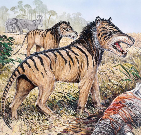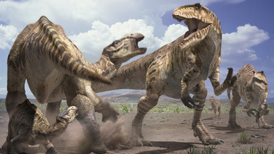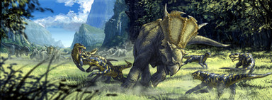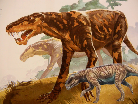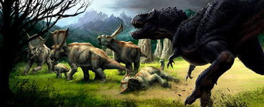The Lycaesaurus is an intelligent, dog-sized predator that hunts in the grasses. Mating for life, pairs dig burrows in the volcanic soil and line them with dry vegetation for their pups (most often twins). They take a wide range of prey, feeding on anything smaller than themselves, and often follow larger carnivores like V. rexes (even at the risk of being bullied by the tyrannosaurs) in the hopes of scavenging morsels from their kills, or using the cover of one of their attacks to grab undefended young dinosaurs, such as that of Ferrucutus.