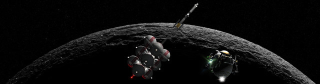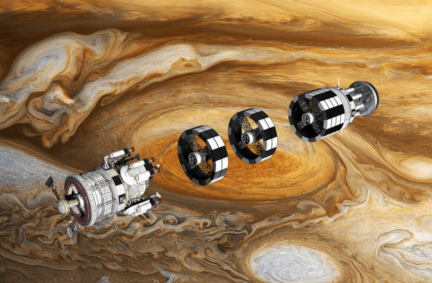 Reaction control jets fire on the Mars Entry Vehicle - increasing the distance between it and the Orion nuclear pulse propulsion interplanetary stage, dropping the Entry Vehicle into a lower orbit. When the distance is increased sufficiently the Orion interplanetary stage will perform one last series of burns, transferring to a high parking orbit for future recovery and use in other applications. The Entry Vehicle completes a partial orbit before arriving at its entry window.