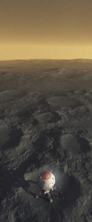 The payload is far too massive for parachute descent, the hypersonic entry vehicle will aero brake on entry. Aero braking is followed by a two stage powered descent mode: primary breaking thrust is applied via four externally mounted Gas Core Open-Cycle nuclear thermal rockets firing in unison, generating a combined 600 gigawatts with a resulting braking thrust of 12 million newtons. These are disposed of just as the vehicle goes sub-mach, separation pyrotechnics sever the heat-shield, followed by the aero shell. Now cut free of the webbing which restrained it through its long flight from Earth, seven LH₂/LO₂ chemical rockets roar to life as the landing vehicle transitions to stage-two powered descent mode, descending on a pillar of flame to the landing target.