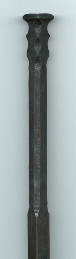 These three pictures are of differnt views of a large inlaid ax, made of steel, and ashwood, and decorated with silver. The patterns on the head were made by carving out channels in the steel, and then cutting them to a dovetail crossection, so that they are wider at the bottom than at the top. I then drew out silver wire to a thickness that would just fit into the channels. Fitting each piece of wire into position, I drove the silver into the channels, so as to cause it to spread out into the dovetail, and become perminantly atached. After all the pattern was so worked I filed and sanded the surface and hafted the ax with a handel I carved from an ash log. The designs are inspired by the inlay work of northern Europe in the 10th and 11th centuries.Related content