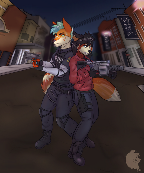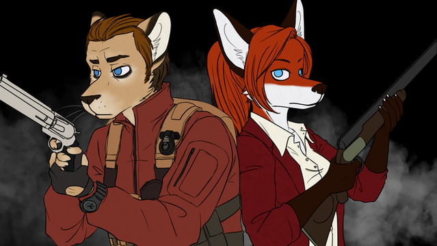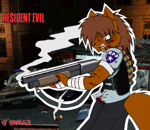 Commission for omgitsbea of her and her boyfriend's characters, Cassie and Raptor, in Resident Evil 5 style.Had fun drawing this piece, and felt it needed a grungy background =3 cos it was a bit plain without... and the plain white bg was way too bright D=