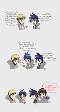 Wow, the anime has taken a weird turn, I say. In the last few episodes, the series has had some absurd plot twists, and I just had to parody on it.The comic was supposed to be longer with three panels, but Flash was being an ass, crashing frequently, which ticked me really off. That aside, it was 2-3 in the morning when I finished this. God, fucking Flash.