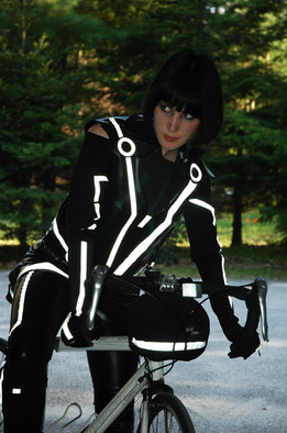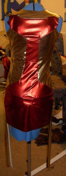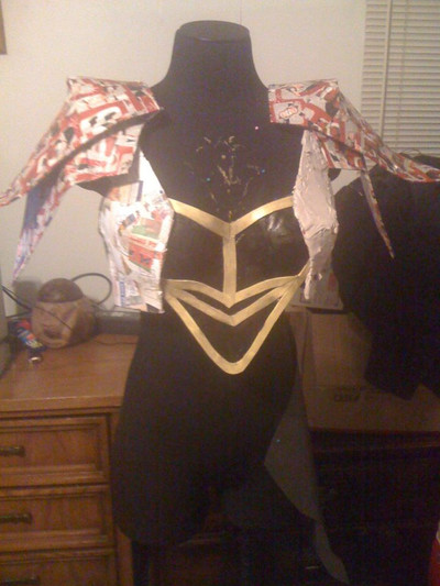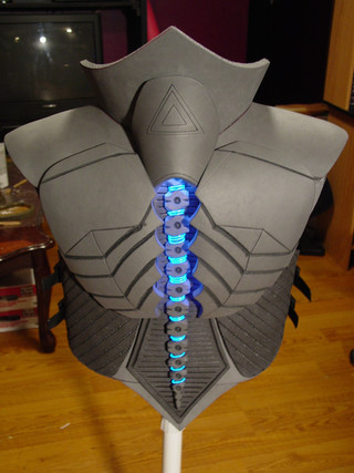 I used black craft foam and reinforced the backs with duct tape. I shaped the foam onto a mannequin, applied heat, and taped/glued/modge-podged the armor together. To solidify the armor even further and make it look less like foam, I used black Plasti-Dip, a rubber coating, to seal it all together. Then for the lights I used white reflective tape.