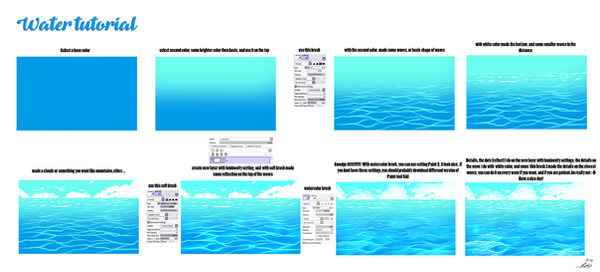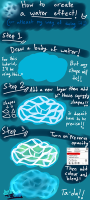 This is my method for not actually drawing waterI think it's quite easy that even beginner can do. You guys can also re-arrange layers' orders, use more materials and try other blending mode to you liking. Feel free to make any change to improve it even better