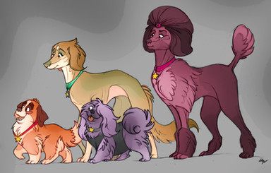 the only definite breed is amethyst, Sheltie. Β the other two are mixed, but I used various breeds that seemed to fit for them, and combined.