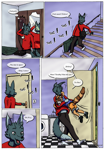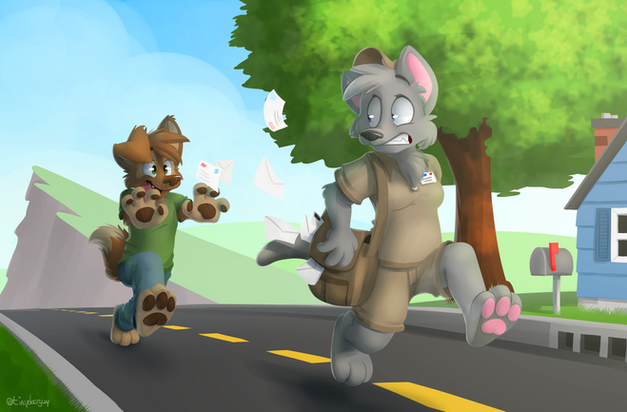 The colours and suburban background detail are absolutely solid, and I'm diggin' the whole mix of domesticated and anthro canines here! It's a great twist on the classic "dog chases mailman" gag, very best of luck in the contest!