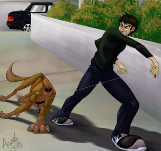 Both, An Entry for 's Contest... and Fanart/Giftart, He is Amazingly Productive and His Art Is So Cool, with a Great Skill at Pencil Colors...in a Ref It Said Kurfust is a Mailman... so I just thought of the (OBIOUS) Gag of The Mailman Getting Chased by a Dog... and I Wanted to Draw Them BOTH... so I Drew Dora as The Dog... Like in a Typical Brothers "Fight"... LOL!