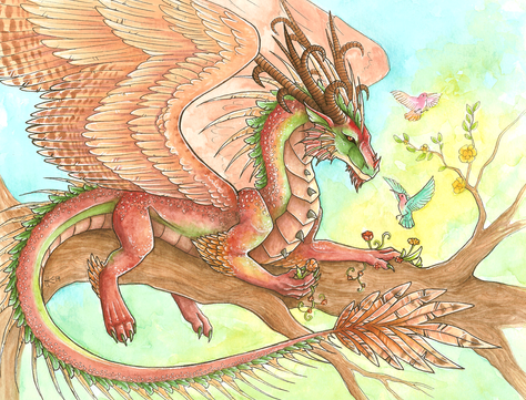 This is in watercolour....wow that must've taken aaaages. Love how you've used natural white of the paper and all the lighting throughout. The branch is so realistic, the dragon itself is super cute