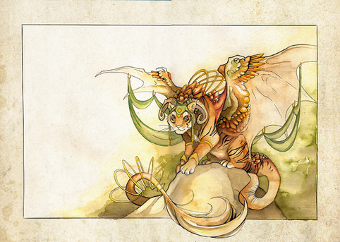 Brushing aside the crackled leaves and old dust, I saw a mark etched into the bronze. It was a gryphon, wings outspread. In its talons it held a bow, arched with living oak boughs at each end. In its beak it pulled back the blood-fletched arrow, ready to strike.I had seen this symbol before...somewhere in a dream. A vision? A great beast rose before me, a billowing length of red behind. A protector, guarding the forests below...
