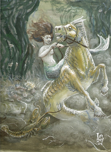 XD How unfortunate for him...but I like your desrip. in any case. Also love the way that you colored the kelpie's transformation, all white on top and evilly blue on the bottom with the tentacley mane, ehehe.