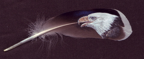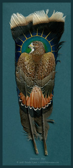 A feather painting of a mantling red-tailed hawk I did for the NAFA 2017 Field Meet raffle. I'm not a falconer yet but that will likely change next year!Β I've never felt so content and at peace as when I'm out in the field with the birds. Seeing them fly in such beautiful surroundings, the excitement of watching them hunt, it makes me feel a joy I can't find elsewhere.Acrylics on four turkey tail feathers.