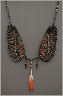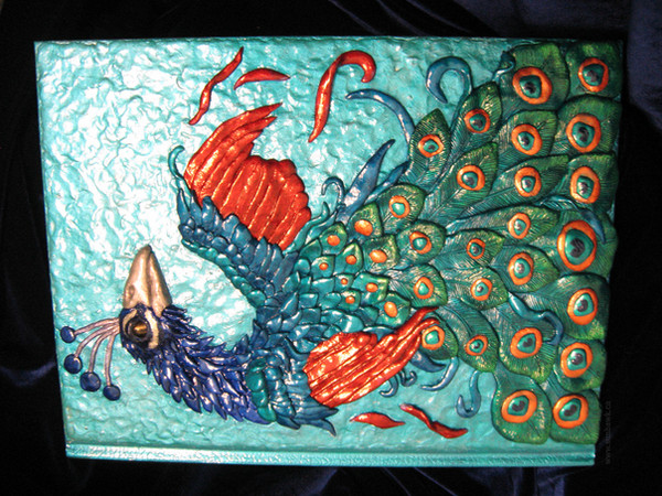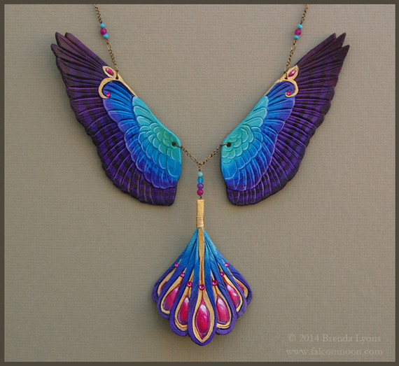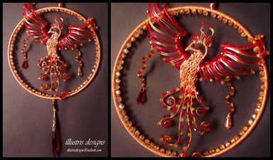 Another leather wall-hanging piece in the same vein as my Rufous Gryphongem.Β This one is a phoenix holding a vibrant blue cat's eye, with a tail wrapped in goldtone wire with all sorts of brilliant stone, glass and metal beads. ΒI'm excited to announce that this piece won Director's Choice in the Anthrocon art show this year!