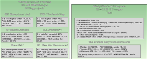 Currently, I'm taking not only the first and last update of each month but also every important update (when something goes to editing/finalization/betareading or starts a new chapter or past). I keep those pictures, write their contents down to an Excel spreadsheet and compare the progress at the end of each quarter. I'll probably make a yearly comparation as well.