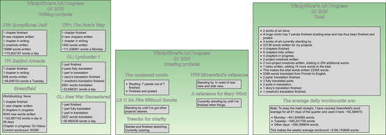 Well, most of these projects are writing projects that can progress with just one sentence a day, which usually doesn't take much time. I've rather often written or translated more than one sentence a day on most of the day's writing projects, but I quite rarely work on, if I were to estimate something, over 600-700 words in a day. Although, it's the drawing projects that suffer from the lack of time, since they need more time in one sitting to even look like there's some actual progress made. I have tons of drawings I want to create, but there's not enough time since they take more time in a day to make and thus I postpone making them, while most of those I begin end up getting semi-forgotten, unfinished and not worked on for indefinite periods of time.