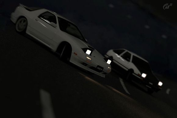 So it was originaly a FC3S picture taken from a gt4 (gran turismo 4) replay. And the same camera angle was taken with a ae86. So i photo shopped and added the ae86 in the background to make it look like both are racing. Added lighting effects ..and other bs. took me 15 min to do all of it...im so bored.Related content
