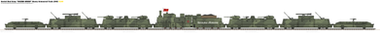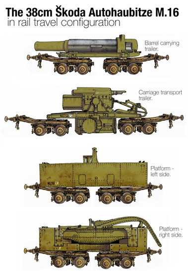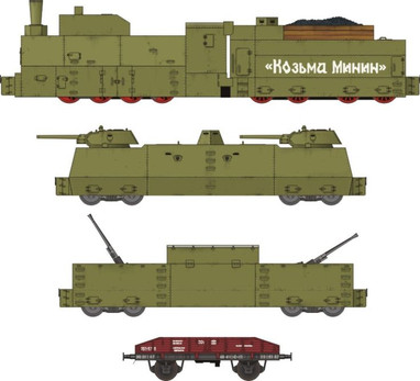 As can be inferred from the above, the weight of the locomotive itself is 52 tons normal and 105 after armouring with 8 -12 mm plate, the fully laden tender weighs in 39 tons normal and 45 armoured (not much armouring on the tender, for obvious reasons) while the weight of the armoured cars is 22 for the machine-gun car, 30 tons for the artillery cars and 12 for the two-axle command car. The howitzer itself is 215 tons, of which 115 are in the barrel and breech itself. The rest of the train cars are between 8 and 10t each because they are standard freight cars while the front wagon only weighs in 6.4 tons, because it's only loaded with some sandbags and a machine-gun.