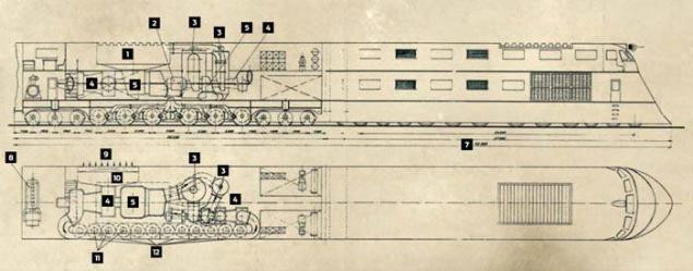 As can be inferred from the above, the weight of the locomotive itself is 55 tons normal (including fully laden tender) and 95 after armouring with 12mm plate, while the weight of the armoured cars is 30 tons for the larger, bogie ones and 12 for the two-axle command car. The howitzer itself is 115 tons, of which 85 are in the barrel and breech itself. The rest of the train cars are between 8 and 10t each, because they are standard freight cars.