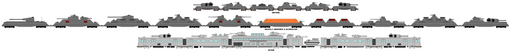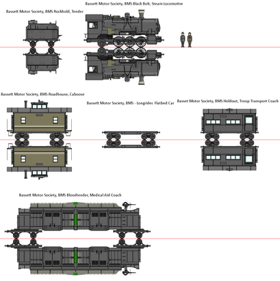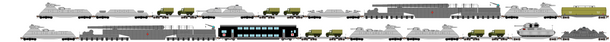 Since this drawing is primarily meant as reference for the comic, I only drew the different type of cars and not the way they fit into the completed convoy. In operation, the actual car order would be: 1_2_3_4_8_9_6_5_5g_5g_10_7, where "5g" is a "gunpowder van" , similar to the general goods van but with the sides made out of steel plate instead of wood (for obvious reasons).
