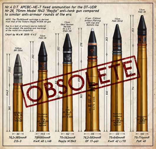 This artillery piece had just been developed as a collaboration between D.T.UDR-Resita, ASTRA-Brasov and CONCORDIA-Ploiesti and represented a perfect blend between the Soviet ZIS-3 57mm.md 1943, the German Pak 40.75mm.md1940 and the British Vickers 75mm.md.1936 AA gun, produced under licence in Romania before the war. The "Resita model 1943", as it was commonly known, had a tremendously high muzzle velocity of 1030m/s, giving it a maximum effective range of 1200m and could penetrate, with the specially built "Costinescu" 6.6kg armour-piercing ammunition, a plate of armour 100mm thick angled 30° from the vertical at 550 metres, which means that at medium ranges it could take on even heavy tanks like the KV and IS series. It's only real drawback was a severely high rate of wear on the rifling which limited barrel life.