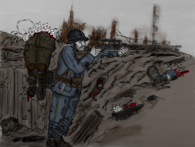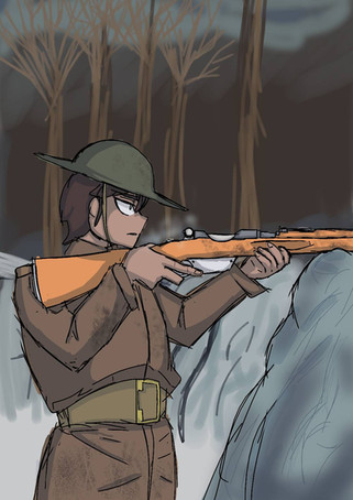 This was originally designed as a 500X100 pixel banner for "Shadowless", but I might have gone a bit overboard with the detailing so I'm posting it as a full fledged drawing, despite it's minimalism.It's meant to represent Jeanne, taking aim with her Md.1886 scoped Lebel rifle trough the mist...
